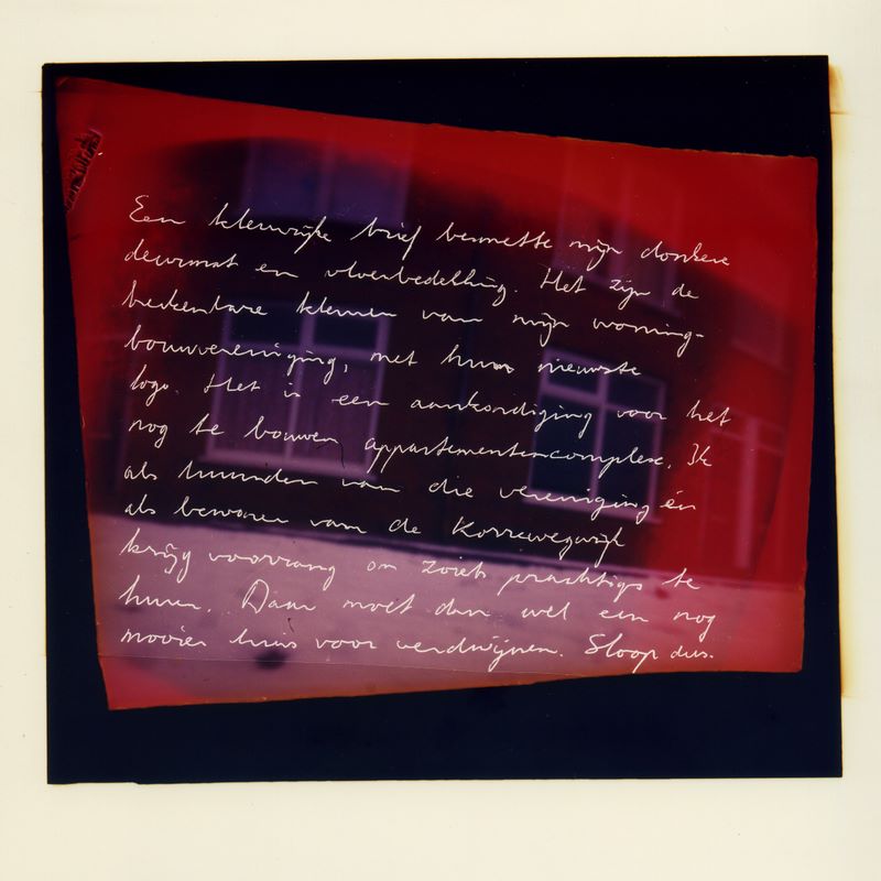 In the series displayed I make use of self-made cameras, no lens, merely a hole. The light subsequently falls onto colour negatives (with Urbanites and Ophef/Commotion) or self-made glass negatives (with Slow Portraits).
